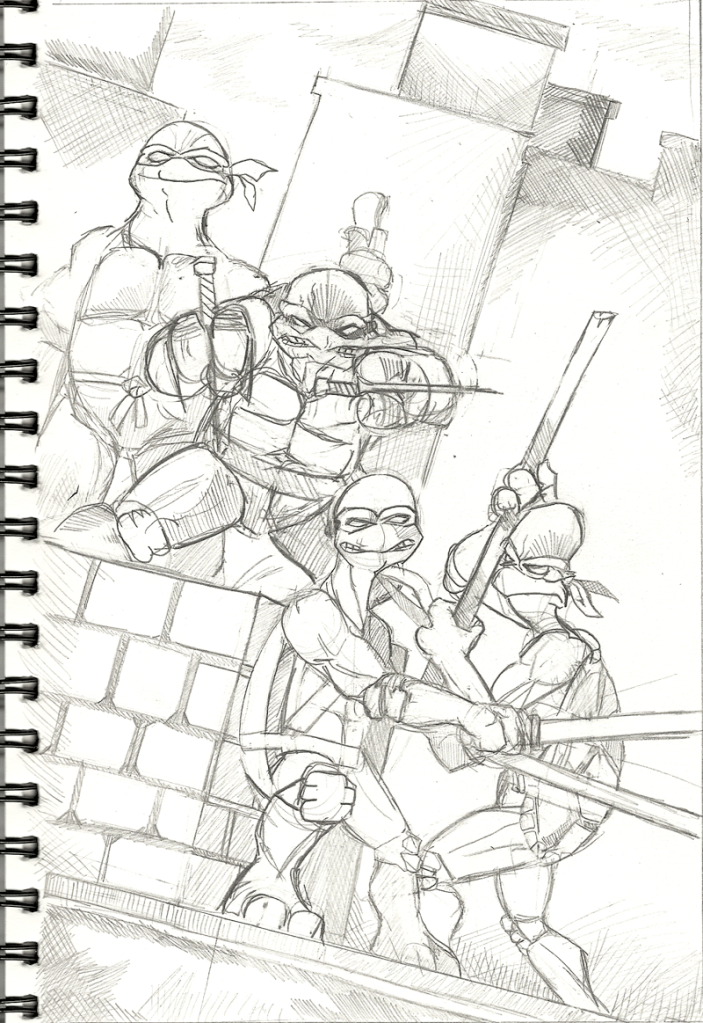 My love of the Ninja Turtles franchise is no secret… what I was trying to do with this image was explore the idea of giving the Turtles’ more individual body shapes to correspond to their personality. Mike’s fairly heavy set from one too many pizzas, Donny’s a literal egghead, Leo’s athletic build tells of his commitment to his ninja training, while Raph’s been hitting the weights hard…